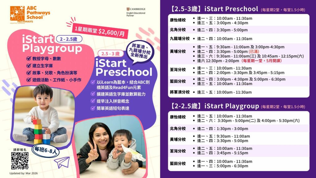 3) iStart Preschool、iStart及iStart Playgroup為一星期2日課程。