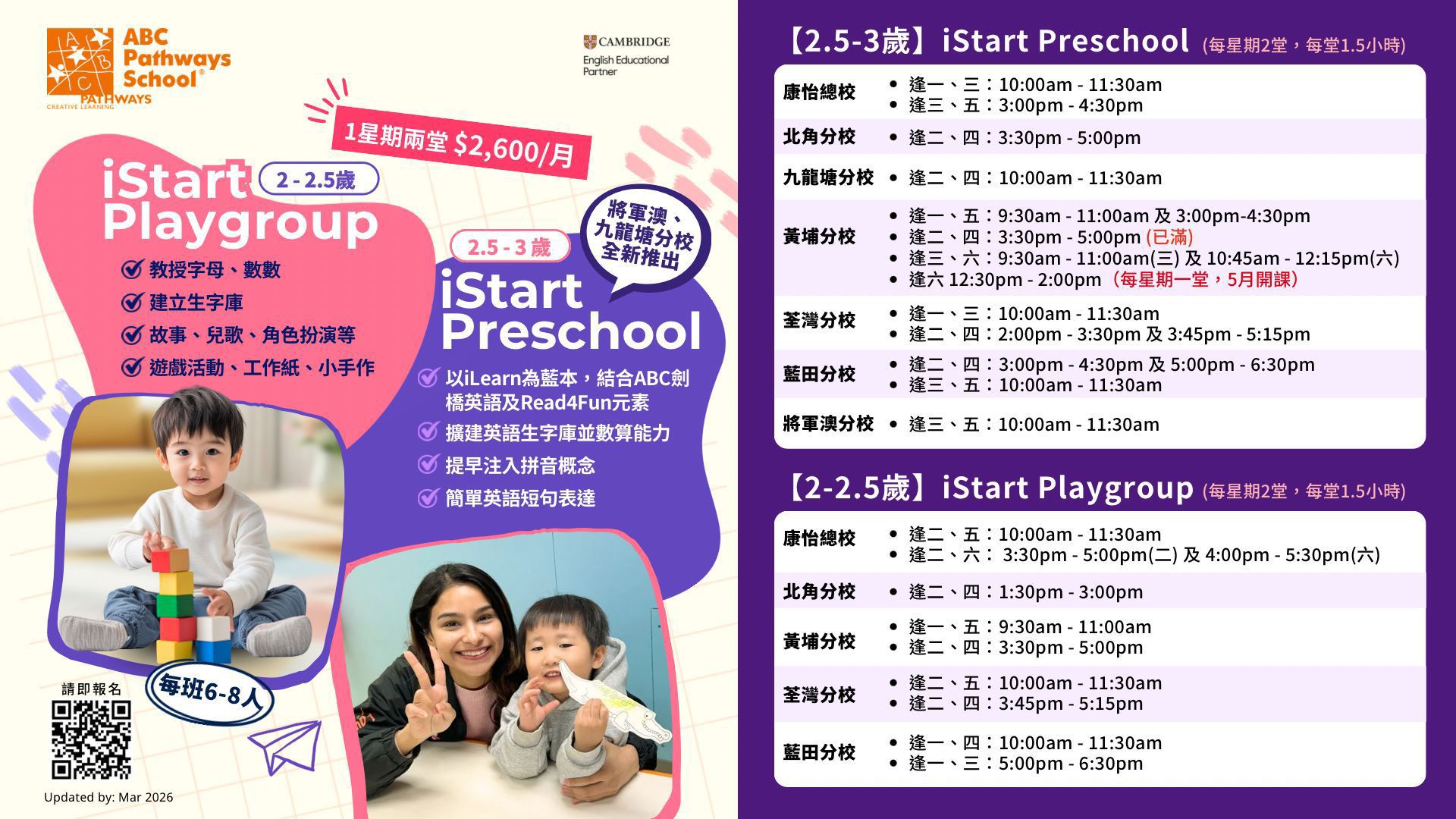 1) 所有ABC課程均按月收費,每級課程另有書簿費(iStart Playgroup 除外)