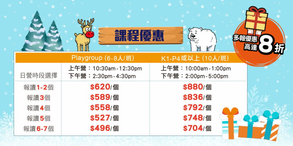 所有課程名額上限為10人 (Playgroup為6 – 8人),先到先得。