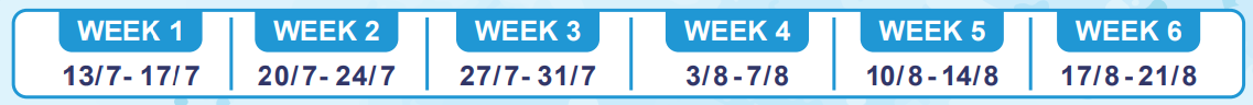 Week 1-3及 Week 4-6 暑期英文課程內容相同,可報3星期: