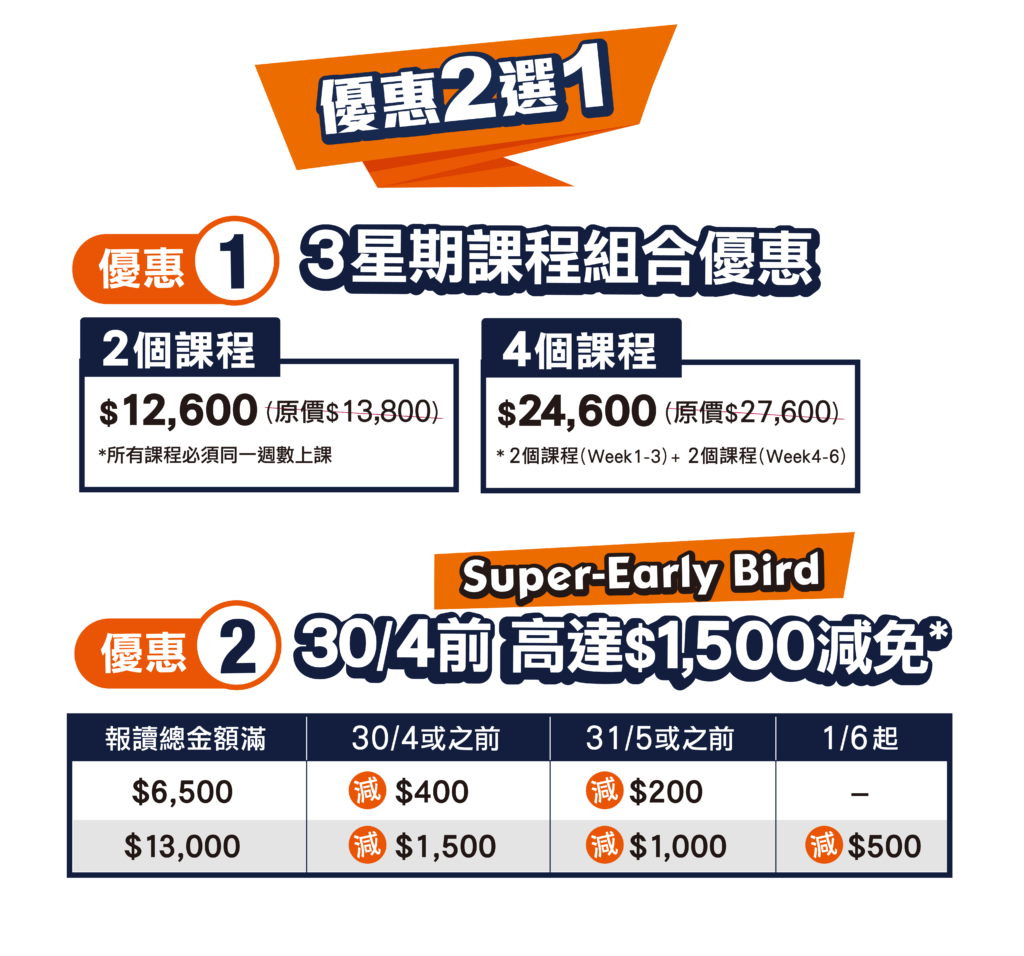 | 4個課程 | $24,600 (原價$27,600) | * 2個課程(Week1-3)+ 2個課程(Week4-6) |