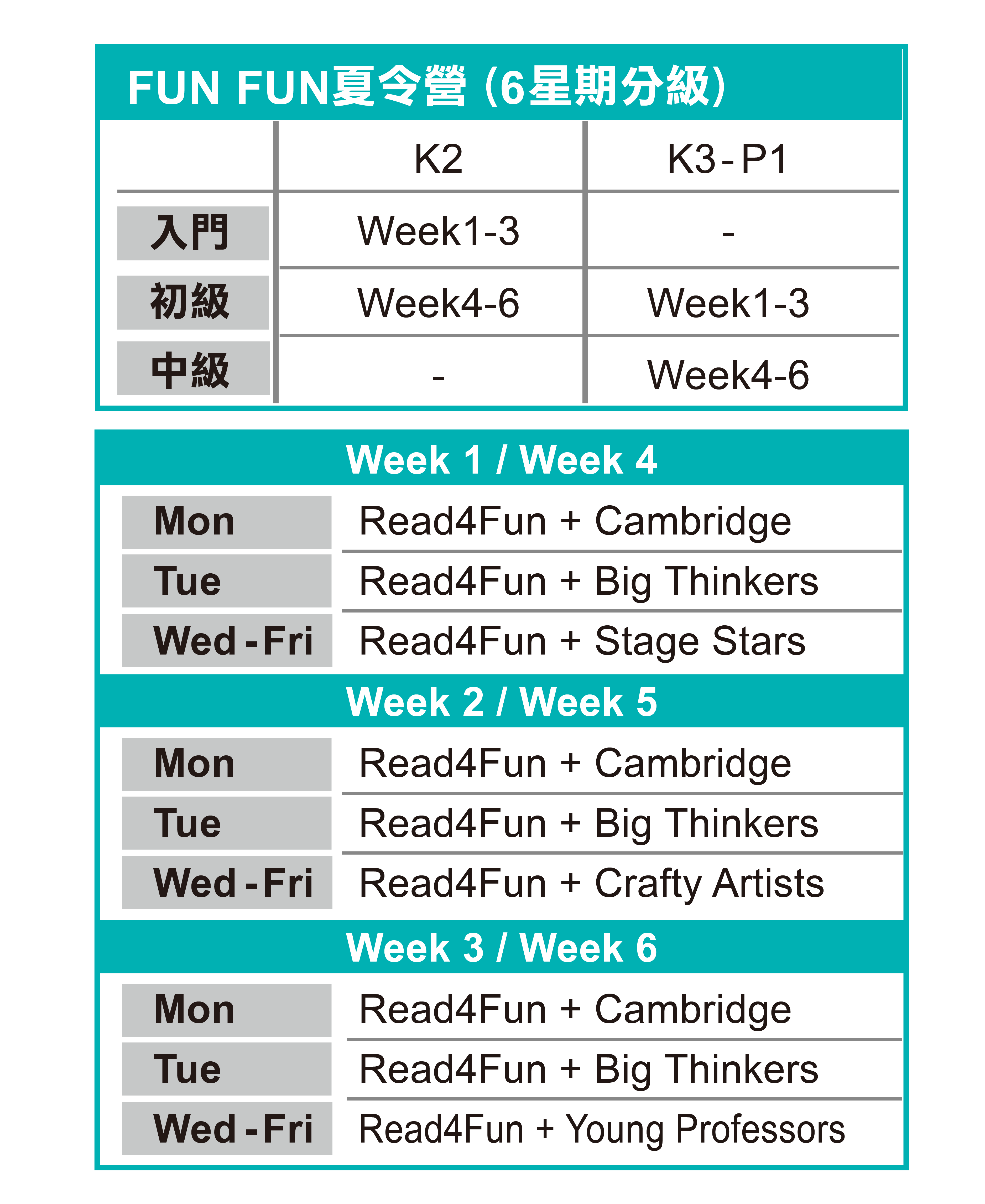 - 除了《劍橋Starters備考及串字班》及《小一預備班》外,其他所有Week 1-3及Week 4-6的暑假英文班內容均不一樣,家長可連續報讀6星期;