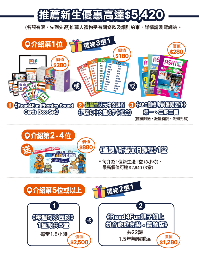 | 介紹第1位 | (禮物3選1) 1. Read4Fun 拼音卡套裝 (價值 $280) 或 2.狀學堂 狀元中文課程《四素句中文速成字卡組合》 (價值 $180) 3. ASK 劍橋考試暑期習作 (價值 $280) |