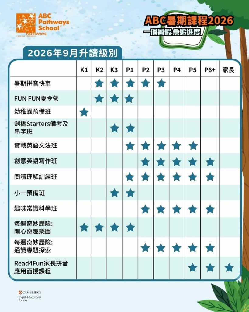 - ABC提供全港最多選擇的暑期英文課程種類,包括:Read4Fun拼音、閱讀理解、Grammar、Summer Camp、劍橋備考班、升幼 / 升小預備班及科學班等等,全面提升學生全方位的英語能力;